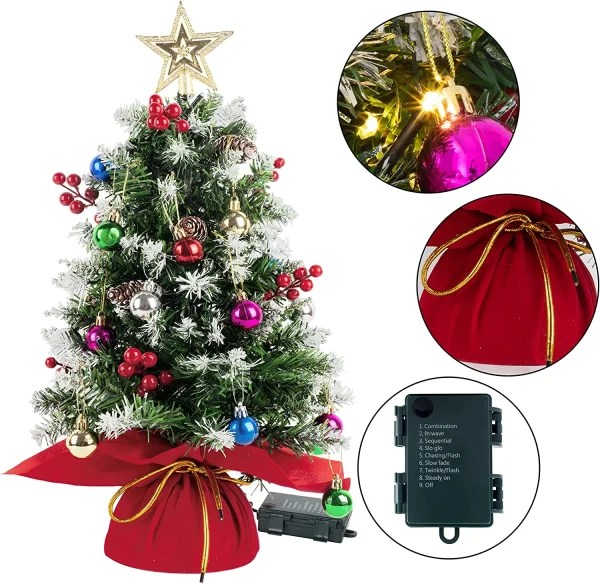 • Our Tabletop Christmas Tree Prelit includes 24 inches Battery Powered Tabletop Mini Christmas Tree with warm white and multicolor String Lights. This comes with One Treetop Star,6 pine cones,7 bunches of red berries, and 24 Christmas ball ornaments. Build your own Xmas tree and bring yourself fun festive memory!