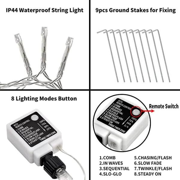 • The light comes with 8 flashing modes to create a unique atmosphere for fun. Lighting modes include flashing, twinkle, waves, sequential, slow-glow, chasing, slow fade, and steady on.
